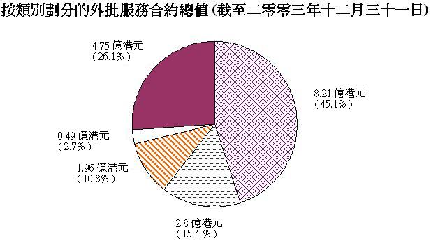 截至二零零三年年底,本署與私人承辦商簽訂的服務合約共有168份,合約總值為18.21億元。外批服務的目的,是提高服務的成本效益和效率。