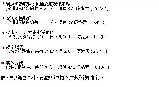 批給私人承辦商負責的服務,包括公眾街市潔淨、街道潔淨、廢物收集、機動清掃街道、機動清理集水溝、市政大廈潔淨、護衞、溪澗防蚊、動物屍體收集、墳場和靈灰安置所潔淨及剪除雜草,以及可循環再造廢物回收等服務。