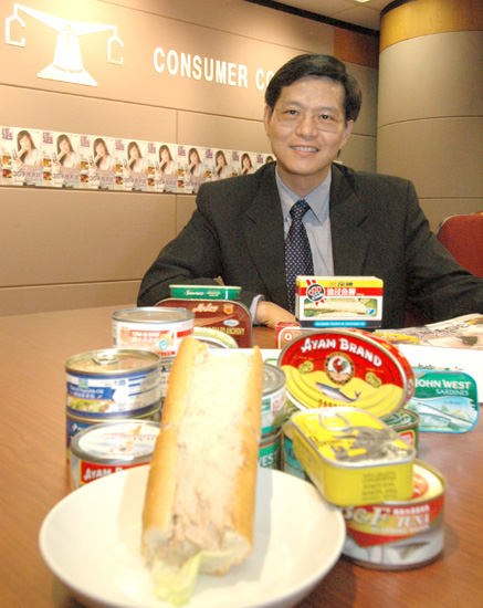 食環署顧問醫生何玉賢在消費者委員會記者會上公布罐頭魚及吞拿魚三文治內的組胺含量研究。