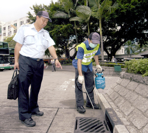 食環署人員噴灑蚊油,防止蚊子滋生。