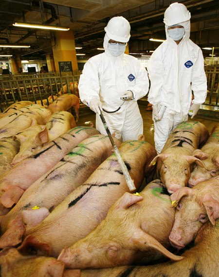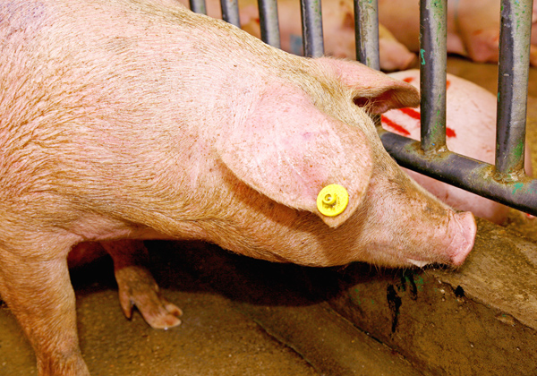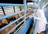 文錦渡牲畜檢疫站人員從廣東省入口的豬隻上收集資料。