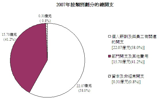 年內,本署的開支總額為38.08億元,其中員工薪酬及津貼和與員工有關連的開支佔22.07億元,部門開支及其他費用佔15.70億元,資本及非經常開支則佔3,100萬元。