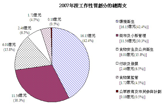 按工作性質分類,本署大部分開支用於提供環境衞生服務(16.15億元),其餘依次為街市及小販管理(11.56億元)、食物安全及公共衞生(6.01億元)、行政及發展(2.46億元)、食物業監管(1.72億元),以及公眾教育及市民參與計劃(1,800萬元)。