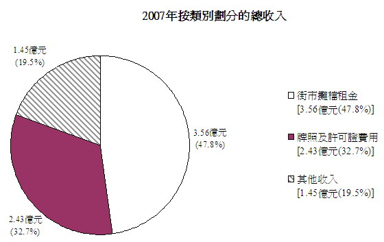 年內,本署的收入為7.44億元,其中大部分來自本署轄下公眾街市攤檔的租金(3.56億元),以及簽發牌照和許可證的收費(2.43億元)。其他收入來源包括墳場和火葬場服務收費(6,500萬元)、肉類檢驗費(2,400萬元),以及其他雜項服務收費(5,600萬元)。