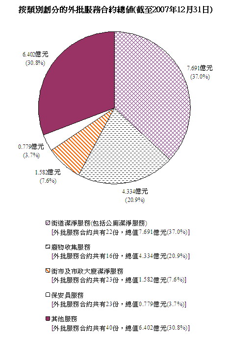 截至2007年年底,本署與私人承辦商簽訂的服務合約共有124份,總值20.788億元。外批服務的目的,是提高服務的成本效益和效率。