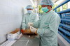 食物安全中心人員在一隻進口家禽抽取泄殖腔拭子樣本,以進行聚合酶鏈反應測試。