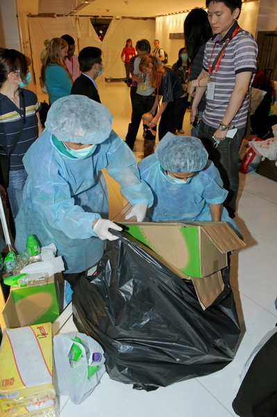 食環署人員在實施隔離令的灣仔維景酒店進行潔淨工作。