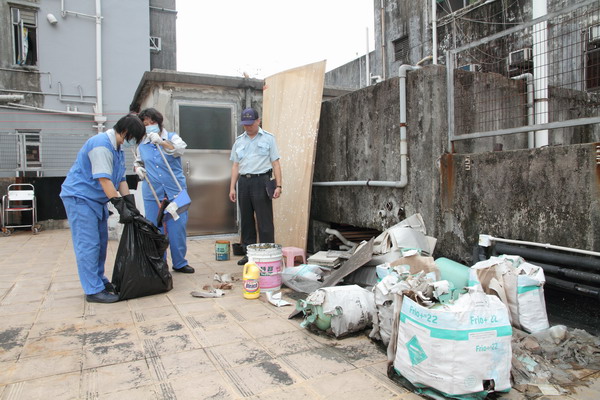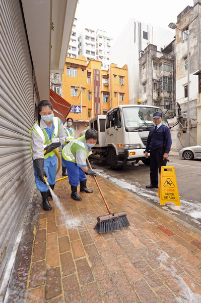 食環署潔淨服務承辦商人員為沒有管理組織的私人樓宇提供一次性公用地方清潔服務。