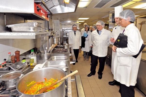 食物及衞生局局長周一嶽在食環署署長卓永興陪同下,檢視東亞運動會餐飲供應商的食物安全及衞生水平。