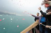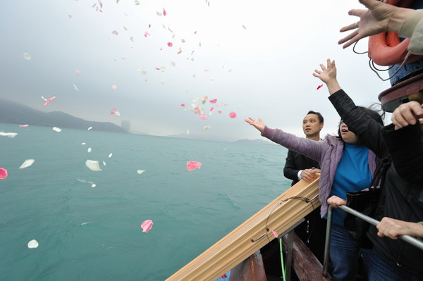家屬將鮮花花瓣撒落海,以寄託思念。