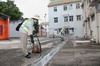 防治蟲鼠人員在村屋外噴灑防蚊油,防止蚊子滋生。