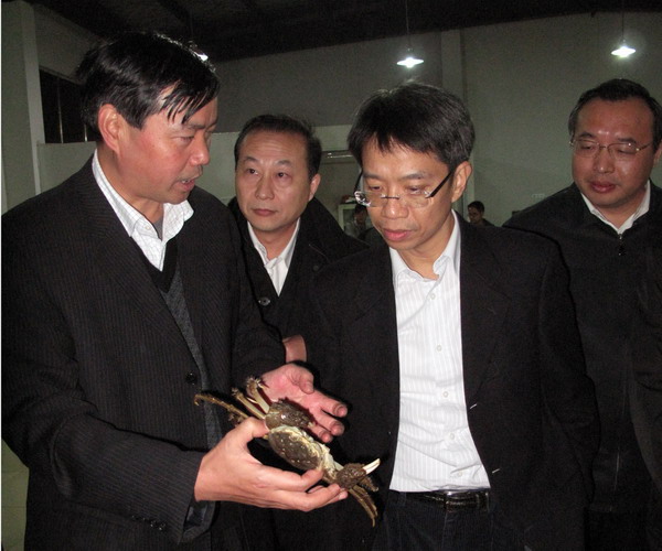 食物環境衞生署署長梁卓文到江蘇了解大閘蟹的養殖情況。