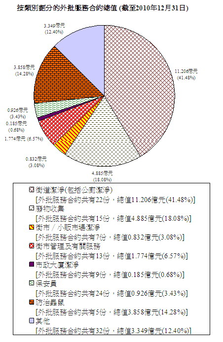截至二零一零年年底,本署與私人承辦商簽訂的服務合約共有127份,總值27.015億元。外批服務的目的,是提高服務的成本效益和效率。