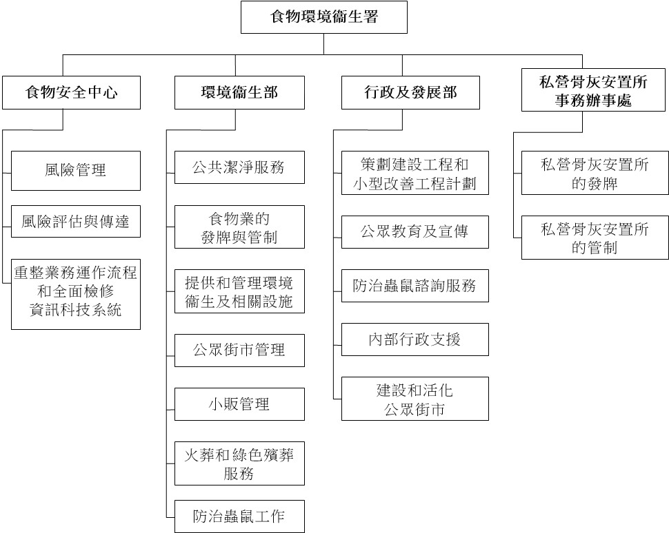 本署的服務由食物安全中心、環境衞生部、行政及發展部和私營骨灰安置所事務辦事處提供(架構圖如下)。本署的部分運作或會對環境造成影響,有關概況將於下文敘述。